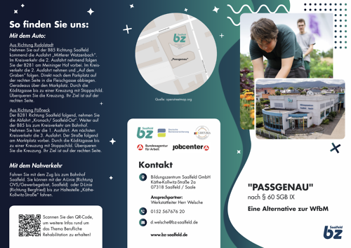 PASSGENAU ist ein Angebot nach § 60 SGB IX und wir bieten Ihnen als „Anderer Leistungsanbieter“ die Möglichkeit einer alternativen Maßnahmenform zur herkömmlichen Werkstatt für behinderte Menschen (WfbM). Im Rahmen dieses Angebotes entwickeln Sie gemeinsam mit uns Ihr individuelles Bildungsziel. Sie können sich theoretisch und praktisch auf die Anforderungen des Arbeitsmarktes vorbereiten. Die Maßnahme ist für Menschen geeignet, die eine Erwerbsminderung haben sowie einen bewilligten Antrag auf Teilhabe am Arbeitsleben oder die Anspruch auf Leistungen nach den § 57 SGB IX haben. Das Angebot wird von der Bundesagentur für Arbeit und der Deutschen Rentenversicherung finanziert.